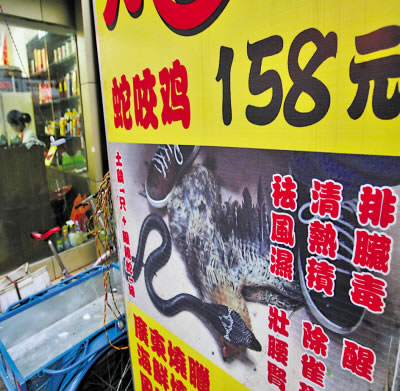 “打死我都不敢吃!”市民劉先生在黃泥塝看到某餐館推出的“蛇咬雞”招牌后說,這些吃法太怪了。劉先生介紹,招牌上還說,吃“蛇咬雞”可以醒腦、除雀斑、排臟毒、祛風(fēng)濕等。“這不僅太殘忍,太血腥,也不道德!睆埮空f,希望這僅僅是個(gè)別餐館吸引顧客而搞的噱頭。