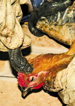 “表演馬上開始!”店里所有顧客都將眼光齊刷刷地盯著該男子的手。只見他左手將母雞死死按在地上,右手從鐵籠中隨手抓了一條長(zhǎng)約1米的眼鏡蛇,用手卡住它的頸部!芭、啪、啪!”只見男廚師不停地拍打著蛇的頭部,試圖激怒它,但眼鏡蛇仍一動(dòng)不動(dòng)!霸趺床灰兀俊睅酌凶庸笮,一些食客也一撥接一撥地走了進(jìn)來。