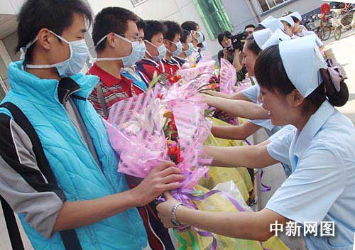 圖為醫(yī)院醫(yī)護人員向?qū)W生們獻花祝賀康復出院。作 者:周秀光