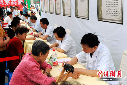 記者在現(xiàn)場(chǎng)看到,文化節(jié)分設(shè)了義診區(qū)、文藝表演區(qū)、展覽區(qū)和咨詢區(qū),除了傳統(tǒng)中藥材、保健品展示外,還將在活動(dòng)期間現(xiàn)場(chǎng)免費(fèi)發(fā)放萬袋解暑良藥。整個(gè)活動(dòng)中尤以中醫(yī)專家現(xiàn)場(chǎng)義診區(qū)最為“火爆”, 不少聞?dòng)嵍恋氖忻褚淮笤缂丛谡刮磺傲嘘?duì)等候,到了中午,各展位前等待問診者仍是絡(luò)繹不絕。其中不僅有注重養(yǎng)生健體的中老年人,亦吸引了不少為健康減肥、樂于食療的年輕人駐足。而在活動(dòng)現(xiàn)場(chǎng)的大型圖片展板上,還詳細(xì)列舉各類食療養(yǎng)生的配方與原理,配合四季介紹了強(qiáng)身、美容的養(yǎng)生茶,吸引了各個(gè)年齡段的人士觀看、解讀與摘抄。