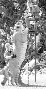 該動物園內(nèi)的一只成年獅虎獸“赫拉克勒斯”目前已經(jīng)長到3.7米長,體重超過了500公斤!當動物園的馴獸師奇娜·約克給“赫拉克勒斯”喂食時,盡管她站在了一個4米多高的支架上,但“赫拉克勒斯”仍輕易地站起了整個身子,并抓取到了奇娜手中的食物。雖然美國邁阿密稀有瀕危物種協(xié)會的環(huán)保專家布哈加文·安特爾博士仍勇敢地站在它身邊,但安特爾的身高只有“赫拉克勒斯”的一半。