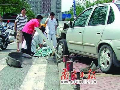 車禍現(xiàn)場對面某玉器檔主稱,當(dāng)時一名30多歲的孕婦正在安全島靠近交通燈處等候過馬路,這時銀色小轎車失控沖破護(hù)欄直奔孕婦!靶∞I車急剎都來不及,重重地撞在孕婦身上,連她后面的交通燈柱都撞歪了。她被夾在小車與燈柱之間,滿臉是血。”“孕婦穿著淡黃色衣服,肚子鼓鼓的,估計懷孕七八月了。被撞后她尖叫一聲,還大喊‘這樣都能撞到’,隨后就不省人事。”圍觀的市民說,救護(hù)車趕到后,醫(yī)護(hù)人員將孕婦抬出,當(dāng)場在地上急救,孕婦的丈夫在旁邊悲傷痛哭。20分鐘后,孕婦被抬上救護(hù)車送院。11時左右,小轎車被拖走。