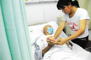昨日(26),西南醫(yī)院,女兒正為父親擦手 記者 張路橋 實習(xí)生 胡健 攝