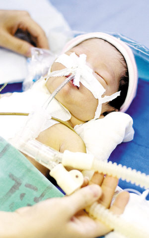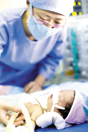 中秋節(jié)前添了個(gè)小寶貝,全家人都很高興。然而秋秋出生后沒(méi)多久,中心婦產(chǎn)科新生兒科的醫(yī)生們就發(fā)現(xiàn)孩子的嘴唇以及全身上下都開(kāi)始發(fā)紫,而且越來(lái)越厲害。于是,中心婦產(chǎn)科醫(yī)院立即借助和胸科醫(yī)院的合作關(guān)系,請(qǐng)來(lái)胸科醫(yī)院的醫(yī)生為秋秋作B超檢查,發(fā)現(xiàn)秋秋屬于紫紺型先天性心臟病,原本應(yīng)該連接左心室的主動(dòng)脈移位,必須盡快進(jìn)行“修心”手術(shù),否則左心室便會(huì)萎縮、喪失正常功能,會(huì)有生命危險(xiǎn)。這突如其來(lái)的打擊讓秋秋的父母痛不欲生,但小兩口仍然堅(jiān)信自己的孩子一定能挺過(guò)這道難關(guān),他們無(wú)論如何也要給孩子看好病。