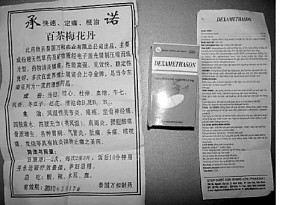 該藥是日前在對(duì)我省部分市縣藥品市場(chǎng)的監(jiān)督檢查中發(fā)現(xiàn)的。在其外包裝上,藥品名稱標(biāo)示為 “DEXAMETHASON”,生產(chǎn)企業(yè)標(biāo)示為“THUOC BAN THEO DON”,包裝盒內(nèi)另附有一份“百茶梅花丹”的中文說明,稱該藥為泰國(guó)萬和藥業(yè)生產(chǎn),是所謂進(jìn)口藥品,為東南亞“抗炎消腫止痛之圣藥”。