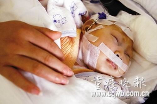 今年9月21日,“何李花”在萬州出生。與醫(yī)生預料的一樣,小花患有先天性腦膜膨出,頭上的腫瘤比正常的頭還大。這時,親人們才知道,李壽英沒有聽從醫(yī)生的建議,生下有嚴重畸形的寶寶。