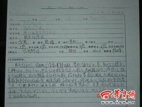 6月26日,張女士再次來(lái)到西安市第四醫(yī)院,復(fù)印出當(dāng)時(shí)的住院病案,病案顯示3年前的那個(gè)手術(shù)共進(jìn)行了110分鐘,并在醫(yī)院當(dāng)時(shí)的手術(shù)記錄里,主治醫(yī)師李震在“手術(shù)及病理情況”一欄,用手寫(xiě)體如此描述了當(dāng)時(shí)的手術(shù)情況:“患者仰臥位……沿結(jié)腸帶尋及闌尾,見(jiàn)其長(zhǎng)約五厘米,萎縮粘附于結(jié)腸腸壁,闌尾系膜高度水腫。將闌尾從結(jié)腸腸壁剝離下來(lái),切斷并結(jié)扎闌尾系膜……切除之標(biāo)本家屬看后送病檢!