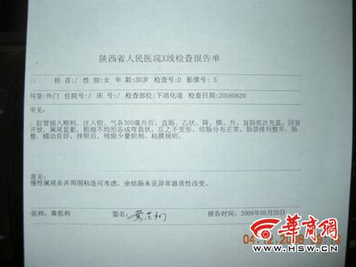 2005年9月12日上午,張女士因慢性闌尾炎急性發(fā)作住進(jìn)了西安市第四醫(yī)院,并于當(dāng)天下午進(jìn)行了闌尾切除手術(shù)。 2008年5月,張女士和丈夫打算要個(gè)孩子,于是在省婦幼保健院做了相應(yīng)檢查,醫(yī)生認(rèn)為張女士腹部的反復(fù)疼痛將影響日后的正常妊娠,建議查明疼痛病因并徹底治愈后再行懷孕。于是,6月份她來(lái)到陜西省人民醫(yī)院進(jìn)行病因檢查,另她意想不到的是,省人民醫(yī)院出具的X射線檢查報(bào)告顯示,疼痛系闌尾發(fā)炎引起。為證實(shí)這一令人窒息的結(jié)果,她又在第四軍醫(yī)大學(xué)進(jìn)行復(fù)查,并經(jīng)多名專(zhuān)家會(huì)診,得出與省人民醫(yī)院完全相同的結(jié)論——闌尾未被切除。