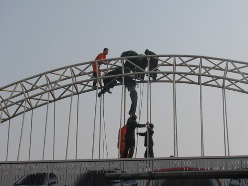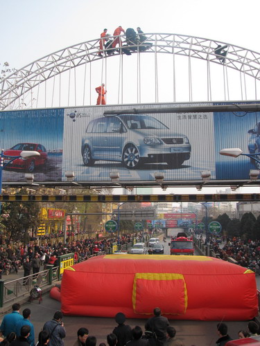 考慮到該男子的人身安全,飯店老板當(dāng)場答應(yīng)拿出100塊錢對其補(bǔ)償,然而廣告架上的男子突然改變了注意,提出了一個荒唐的理由,聲稱要市長到場自己才肯下來。時間一秒一秒的過去了,僵持還在繼續(xù),所有的勸說都是徒勞,此時廣告架下邊的的救生氣墊也出現(xiàn)了意外,原來,向氣墊里充氣的充氣機(jī)因長時間使用,機(jī)器的油料快用完了,于是現(xiàn)場指揮員立即對充氣機(jī)進(jìn)行了更換。由于現(xiàn)場圍觀群眾太多,指揮員馬上與大隊取得了聯(lián)系請求消防二中隊前來增援。