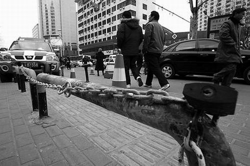 昨天下午5時(shí)許,銀行下班,保安再次將鐵鏈扯到東側(cè)鎖好,問到為何要在門前上鎖,對方稱防止往里停車,“萬一絆倒人咋辦?”梁先生問!安粫,鏈子有顏色!北0舱f!澳枪饩暗的時(shí)候咋辦?”追問之下,對方無話可說。