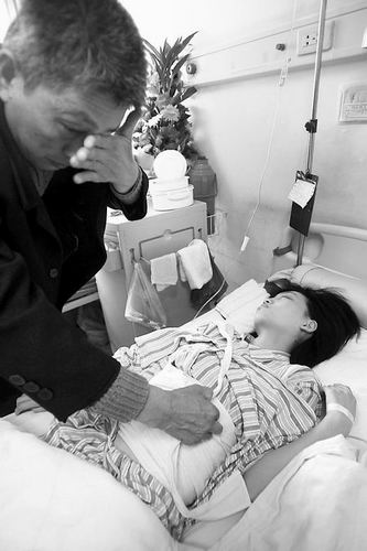 “醫(yī)生說,脾臟摘除,孩子算是終身殘疾了。”昨天(12月23日)上午,在河南省人民醫(yī)院肝膽移植科病房里,來自湖北咸寧的陳仁平看著孩子身上16厘米長的傷口,傷心得直抹眼淚。十多天前,23歲的女兒小娟陪人取錢時(shí),不慎被一家銀行門前扯的鐵鏈絆倒摔傷,可他無論如何不會想到孩子摔這么慘。