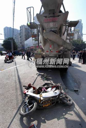 上午11時35分左右,記者趕到事故現場時,一輛水泥攪拌車停在靠近匯多利建材市場旁的路口,被撞壞的電動車零件散落一地,倒在一旁。水泥攪拌車后輪后留下一道長長的鮮血痕跡。