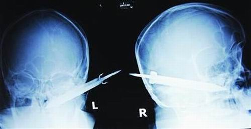 經(jīng)過(guò)檢查,醫(yī)生說(shuō)這把長(zhǎng)有10厘米左右的刀,從右耳窩上前方直接刺進(jìn)了鼻腔,離頜內(nèi)大動(dòng)脈很近,刀卡在了骨頭中,要取出這把刀最怕大出血,萬(wàn)幸的是這把三棱刀并沒(méi)有傷及大腦。