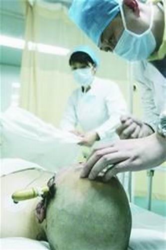 昨晚7時(shí)40分,剛被推出CT檢查室的文文,已被剃光了頭,頭上的黃色木刀把在燈光下反光。嘴巴、鼻子周?chē)难呀?jīng)凝固。