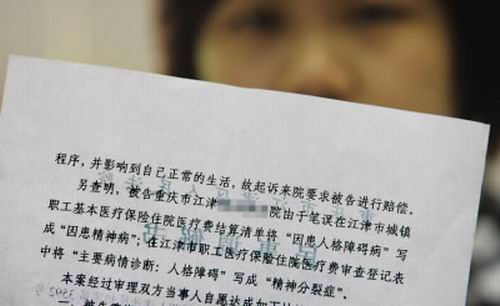 昨日,小玫趕到重慶向記者出示了調(diào)解書。法院查明,當初醫(yī)院在小玫醫(yī)保住院醫(yī)療費結(jié)算清單中將“因患人格障礙病”寫成“因患精神病”和在“職工醫(yī)保費用審查登記表”病情診斷一欄中將“人格障礙”寫成了“精神分裂癥”,都是筆誤。經(jīng)過調(diào)解,醫(yī)院愿意將上述兩處“筆誤”改過來,即把精神病的鑒定刪去,不過依然保留對患者有“人格障礙”的結(jié)論。小玫說作為調(diào)解的條件,她放棄了6萬元的索賠請求。