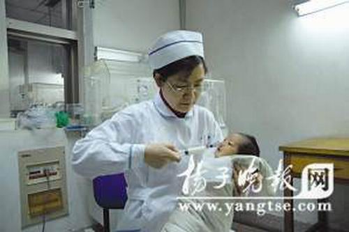 4日上午,記者來(lái)到儀征市人民醫(yī)院婦產(chǎn)科,只見(jiàn)朱汝成護(hù)士長(zhǎng)正在用針管小心翼翼地給“小牛娃”喂奶。由于小家伙鼻腔和口腔相通,不能自己喝奶,每次只能用針管,還要小心謹(jǐn)慎,生怕嗆著孩子。記者注意到,“小牛娃”用依戀的眼神看著護(hù)士長(zhǎng),朱護(hù)士長(zhǎng)說(shuō),每次看見(jiàn)小孩子的眼神,心里特別難過(guò),自己也是母親,知道這么個(gè)小生命實(shí)在太脆弱了,F(xiàn)在自己照顧他,就把他當(dāng)成自己的孩子,孩子是無(wú)辜的,他也是一個(gè)小生命!靶∨M蕖背酝昴毯,朱護(hù)士長(zhǎng)又把他放進(jìn)幼兒床里,因?yàn)榕滦〖一镏鴽,辦公室的空調(diào)始終開(kāi)著,從正月初三起,婦產(chǎn)科全體醫(yī)護(hù)人員輪流照顧孩子,并給孩子購(gòu)買(mǎi)奶粉、衣服、尿不濕等必需品。