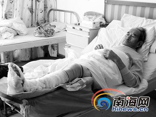 3日下午,記者在海南邊防醫(yī)院見到了受傷的張老漢。老人躺在病床上,左腳纏了繃帶并用木板固定住。張老漢回憶說,1日下午4點(diǎn)左右,他在博愛南路過馬路,打算去附近的東湖站臺乘坐剛到站的36路公交車。這時,一輛開往博愛南路方向的摩托車緊貼著他的身子急速行駛過來。摩托車后輪的輻條將他的左腳“拐”進(jìn)車輪內(nèi),他覺得一陣鉆心的疼痛。“之后,我被拖行了2米多,摩托車才停了下來,我趁機(jī)將腳抽出來,司機(jī)卻開著車跑了”。張老漢氣憤地說。