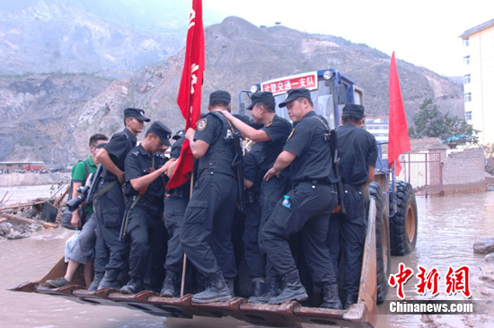 中新網(wǎng)舟曲8月9日電(劉賢 徐楊祎)成都公安特警兩批共150名救援官兵于9日先后到達(dá)甘肅舟曲災(zāi)區(qū)。救援官兵組織的35人青年突擊隊(duì)已協(xié)助武警和當(dāng)?shù)孛癖瘸?名遇困群眾,挖出兩具遇難群眾遺體。
