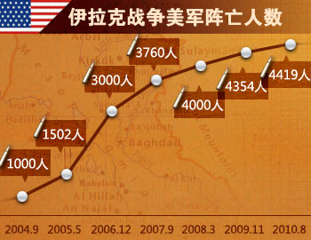 在攻打伊拉克的大規(guī)模軍事行動(dòng)中,美軍只有138名軍人喪生。但此后美軍頻繁遭到伊拉克境內(nèi)反美武裝的襲擊,傷亡人數(shù)不斷攀升。截至2010年8月16日,駐伊美軍死亡總數(shù)已達(dá)4415人,另有約3.2萬(wàn)人在戰(zhàn)斗中受傷。龐大的軍費(fèi)開(kāi)支也給美國(guó)經(jīng)濟(jì)造成沉重負(fù)擔(dān)。截至2010年8月19日,美國(guó)用于伊戰(zhàn)的開(kāi)支已達(dá)7423億美元,平均每天耗費(fèi)2.75億美元。