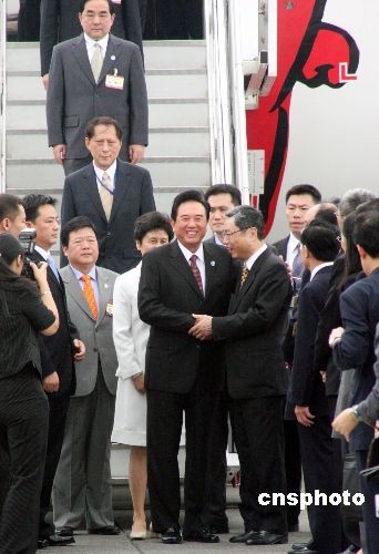 圖為陳云林步出包機(jī),與前來接機(jī)的;鶗(wù)副董事長高孔廉握手。