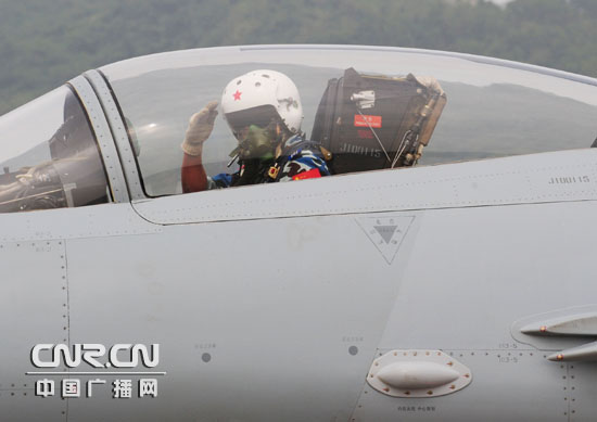 勝利返航,航空兵某師副師長、空軍特級飛行員嚴(yán)鋒招手致意。