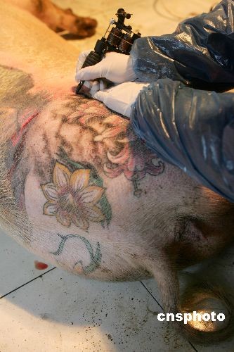 11月4日,記者前往比利時藝術(shù)家威姆德沃伊(Wim Delvoye)在北京郊區(qū)的“藝術(shù)農(nóng)場”,他在農(nóng)場里養(yǎng)的十幾頭豬只只價值連城,因?yàn)檫@些豬身上都被紋上包括世界知名品牌LV,或者人物、動物、神話故事等卡通風(fēng)格圖案。這些紋身豬皮最高可賣到100萬元,因此這些紋身豬吃好喝好,過得比人還舒服。中新社發(fā) 富田 攝