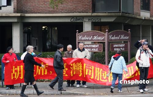 來自大華府地區(qū)數(shù)千名當(dāng)?shù)厝A僑華人和中國留學(xué)生,11月14日手拉橫幅準(zhǔn)備迎接參加20國集團(tuán)金融峰會的中國國家主席胡錦濤。