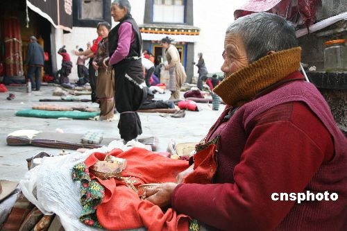 3月14日,藏族信徒一如尋常前來大昭寺轉(zhuǎn)經(jīng)朝拜。唯一不同的是,大昭寺廣場和八廓街顯得格外寧靜,很難看到往日涌動的游客,八廓街不少商店和攤鋪還在營業(yè)但生意冷清。中新社發(fā) 王林 攝