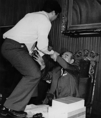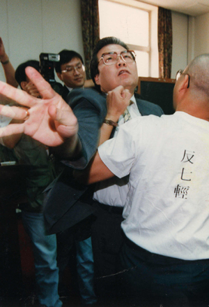 當(dāng)朱高正跳上主席臺(tái),議場(chǎng)內(nèi)頓時(shí)像爆發(fā)的活火山,趙少康等人沖上發(fā)言臺(tái),抓住高站在主席臺(tái)上的朱高正的腳踝。后排的“立委”則大喊“上!”“打死他,打死他!”,個(gè)個(gè)爭先恐后沖向主席臺(tái)。