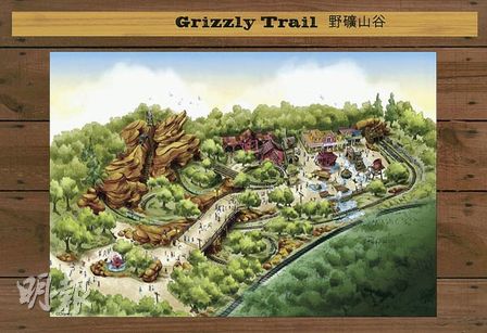 主題園區(qū)的故事設(shè)定于偏遠(yuǎn)淘金小鎮(zhèn),但大灰熊卻因淘金被觸怒。一班尋金者乘“大野礦山飛車”橫越整個(gè)小鎮(zhèn),但飛車在崎嶇斜坡上突然急速倒駛,一群實(shí)物原大的發(fā)聲機(jī)動(dòng)大灰熊也會(huì)施襲搞破壞,弄得乘客東歪西倒,最后更會(huì)觸動(dòng)炸藥裝置,令飛車從山中高速“噴射”出來(lái)!按笠暗V山飛車”相信是這次擴(kuò)建中,刺激度最高的一個(gè)設(shè)施。