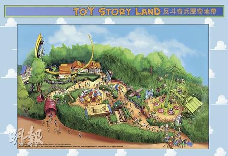 以電影《反斗奇兵3》為骨干,在區(qū)內擺放各式超巨型玩具,旅客置身其中,如變了小矮人。區(qū)內有3個機動游戲:其一是賓客坐上如“臘腸狗”的設施,經歷一段顛簸旅程;另一設施是一臺穿梭飛車,接載賓客沿高達數十呎的U形軌道快速來回;最后是一個“跳傘”訓練旅程,賓客可因應喜好,調校從25米高臺向下急墜的速度。