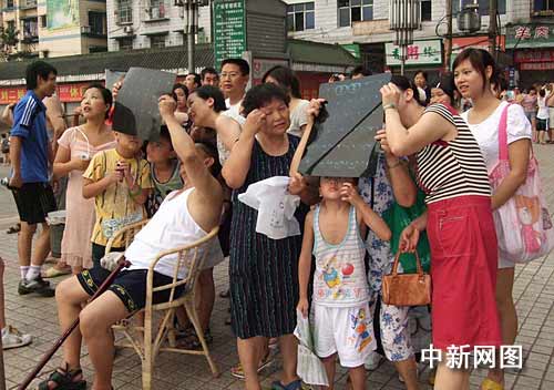 7月22日上午,500年一遇的日全食天文奇觀讓整個宜賓縣沸騰了,老老小小,男男女女都跑出來觀看。記者在現(xiàn)場看到,有戴著墨鏡觀看的,有拿望遠鏡觀看的,有用焊工專用鏡觀看的,有拿茶葉包裝紙觀看的,有人用照相機照著相,有人用著攝像機……廣場上、院子里、壩壩頭到處站滿了人,大家都擠在一起驚嘆著:“看,太陽慢慢變小了,成月亮了,只有光圈了,天黑了……”