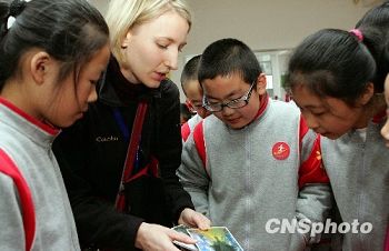 12月7日,2009年“漢語橋——美國中小學校長訪華之旅”代表團首次來閩交流訪問。70名代表中,33名代表來福州參觀訪問,37名赴廈門參觀訪問。圖為美國科羅拉多學院代表正與福州實驗小學學生交流,介紹美國風景。據(jù)了解,近年來,美國開設漢語課程的中小學大幅增加,已由2005年的263所增至2009年779所。漢語已經(jīng)成為美國外語教學中發(fā)展最快的語種。(中新社/張麗君 攝)