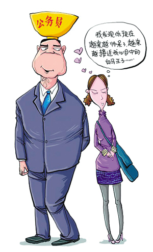“嫁個公務員,就像買了一只潛力股。沒漲的時候,收入穩(wěn)定,有福利保障,一旦升遷,隨著職場地位的提高,帶來的精神和物質上的附加值是不可估量的!贝髮W畢業(yè)3年,在一家設計公司任職的黃露是一名資深“嫁碗族”,在她馬不停蹄的相親路上,對公務員總是大開綠燈,“一聽說是公務員,好感會直線上升!