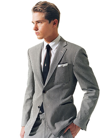 七:條紋外套?肯定!再發(fā)愁你的條紋西裝沒法穿么?的確,如今大概只有四歲的孩子和沒有時尚品味的人才會選擇那種淺色的泡泡紗外套來作為自己的“出場”服裝。但是,告訴你個方法,只要簡單的加上黑色和白色的話,這款搭配就變得相當(dāng)?shù)挠行汀⒊墒炝。搭配白色的襯衫,黑色的領(lǐng)帶,和一塊口袋方巾,那么無論是日常的辦公或者是小型的PARTY聚會,就都很合適了!