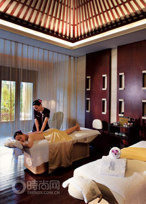 大堂所在地是一座高高在上的宮殿式建筑,檐角高挑,莊重有儀,進來后,一條長長的木廊道直通向光的盡頭,皇家的氣派表露無遺。整個酒店的設(shè)計靈感則來自北京頤和園的經(jīng)典建筑設(shè)計,包括斜尖屋頂、深色實木、復(fù)雜細致的雕刻和馬賽克鑲嵌裝飾等,精品購物店的外墻讓人熟悉地看到天安門城樓的影子,而名為“雪閣”的雪茄吧看上去就像微縮的天壇。這是亞龍灣面積最大的酒店,空間足夠開闊,除了主體建筑和附屬設(shè)施外,33座備有私人管家及獨立泳池的私家別墅散落在亞龍灣幽靜的細白沙灘和紅樹林保護區(qū)之間,據(jù)說每座別墅都有露天日光浴平臺,還有水天相接的無邊際泳池,這種奢華而私密的家庭度假并不適合一個人來此的我。在去往房間的通道里,一樣能感受得到酒店空間上的奢華:所有的房間都只靠一側(cè),走廊的另一側(cè)是通透的玻璃大窗,風(fēng)景不只屬于陽臺,走路的人也可以看到風(fēng)景!