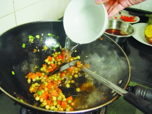 4 燒熱1湯匙黃油,炒香蒜末、蔥末、紅蘿卜丁和青豆,倒入咖哩醬料包炒至香氣四溢,注入1碗清水攪勻煮沸。