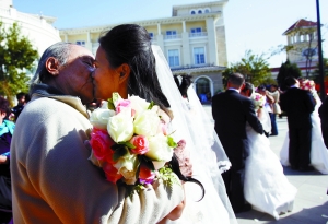 “你愿意做我妻子嗎?”81歲的吳介琴單膝跪地向愛人蔣曉輝求婚時(shí),在場(chǎng)親朋給予3分鐘的掌聲。昨日,與另十對(duì)網(wǎng)戀成功的情侶一起,81歲的吳介琴與小自己23歲的蔣曉輝走進(jìn)結(jié)婚殿堂;楹笏麄儗⒃谒拇ㄉ。