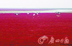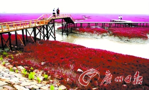 在美麗、富饒的遼河三角洲的海岸灘涂上,延綿百里、大片地生長著一種生命力頑強(qiáng)的潮間帶植物堿蓬草。堿蓬草每年四五月間長出地面,初為綠色,由于受海水的浸泡,太陽光照射下漸由綠變紅,9月至11月,呈紫紅色。秋風(fēng)吹拂下,紫紅色的堿蓬草涌起重重的波浪,“紅海灘”因此得名。