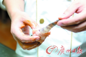 2. 把大蝦剝掉蝦身部分的殼,用小量鹽和味精略腌一下,再把雞中翅從蝦尾穿入,套在中間。