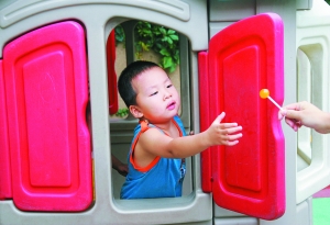 錛錛是小區(qū)里最受歡迎的寶寶之一,因為他見誰都瞇著眼睛笑,不逗時微笑,一逗就大笑。右:錛錛對棒棒糖的喜愛不亞于肉類,看在棒棒糖的份上,相當(dāng)配合記者叔叔阿姨。