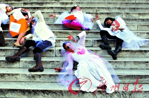 11月20日,一群女子在羅馬一廣場穿著帶血點的結婚禮服抗議家庭暴力。