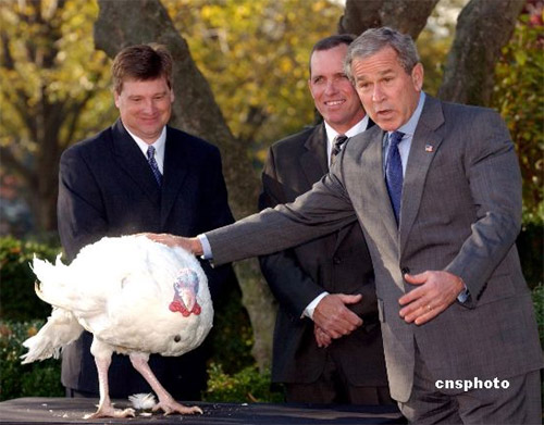 美國(guó)一年一度的感恩節(jié),美國(guó)總統(tǒng)布什特別依照慣例,在白宮赦免了2只火雞,溫馨又有趣。去年總共有2只火雞得到總統(tǒng)的免死金牌,分別叫“May”和“Flower”,也就是07年清教徒來到新大陸所搭乘的“五月花號(hào)”的意思。