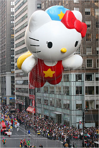 洛杉磯的小姑娘打扮成花季天使,和父母親一起參加十一月下旬的感恩節(jié)歡慶活動。感恩節(jié)連日長假,是每年美國人最重要的娛樂購物節(jié)慶之一。07年美國紐約在當地時間22日舉行了感恩節(jié)大游行,萬人參加場面熱烈。巨型卡通造型的氣球吸引了很多人?偣灿11個大氣球加入游行,其中包括在天上飄的凱蒂貓,吸引現場所有人的目光,多達800名小丑和11支樂隊,以及2000名拉拉隊員和舞者,將整個游行氣氛推向高潮。 一位紐約市民幽默的說:“我喜歡的是最后會出現的耶誕老人,因為這樣我們可以趕快離開,然后回家開始吃火雞!”
