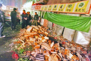 昨日下午,小吃店周圍的地面上遍布油漬和水跡,幾名男店員將倒塌的外墻瓦礫鑿開(kāi)、運(yùn)走。對(duì)于事發(fā)時(shí)的情況,店員均不愿多談。據(jù)目測(cè),坍塌的外墻寬約3米,高約2.5米。