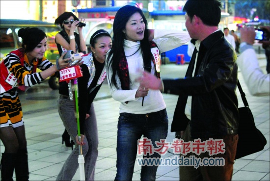 由于她們身材高挑、長相標(biāo)致、穿著性感,很快便吸引了大量圍觀者。起初現(xiàn)場沒有人愿意接受這些行為怪異的女“記者”采訪,采訪受阻后,美女們將目標(biāo)重新定位,瞄準(zhǔn)了過往行人中的帥哥。效果還不錯(cuò),其中幾名帥哥抵擋不住“辣妹”的誘惑,非常豪爽地接受了采訪。