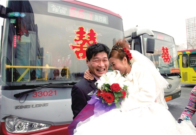 新娘賈春穎是661路的調(diào)度員,于浩在309路開(kāi)車(chē),同是公交員工,又同在一個(gè)車(chē)隊(duì),“我們倆因此不謀而合地想用公交車(chē)做婚車(chē)!辟Z春穎說(shuō)。