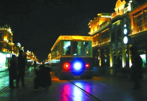 傍晚近6時(shí),鐺鐺車頭兩紅一藍(lán)的車燈亮起,車頂亮起了一圈橙色裝飾燈,開出了天街北口的泊車點(diǎn)。工作人員介紹,鐺鐺車以后每天將運(yùn)營到晚9時(shí),進(jìn)行一次夜間試車,以確保元旦正常運(yùn)行。