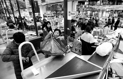 昨天下午2:30左右,記者在宜家商場內(nèi)看到,不少消費(fèi)者不顧昨天是上班日,紛紛翹班前往血拼。商場內(nèi)幾乎各個(gè)區(qū)域都擠滿了人。在收銀處,30個(gè)收銀臺(tái)前全部排起了長龍,幾乎每條隊(duì)伍都有近50米長。在一條通道口,一名保安指著身旁的一堆購物袋告訴記者,這些都是不愿排長隊(duì)買單的顧客留下的,因?yàn)闁|西買得不多,又不情愿排長隊(duì)付錢,所以寧愿不買了。