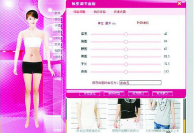 “網(wǎng)上試衣間”類似于網(wǎng)絡上曾經(jīng)流行的 “美女換裝游戲”,只是由專業(yè)公司開發(fā)的 “網(wǎng)上試衣間”,它可以根據(jù)網(wǎng)民自己上傳照片、填寫三圍,而設計出一個虛擬的“我”,在試衣間里試各種各樣的衣服。在一個試衣網(wǎng),網(wǎng)友可以點擊相關設置中的模特、頭像、體型、背景等,更換自己喜歡的模特、頭像和不同顏色、風格各異的試衣背景,體型選項中為顧客提供了三圍、肩寬、身高、臂長等參數(shù),顧客可以調(diào)整這些數(shù)據(jù)使模特的體型接近自己,制造完自己的模特后便可以在服裝欄中鏈接的網(wǎng)店去隨意挑選自己滿意的服裝了。